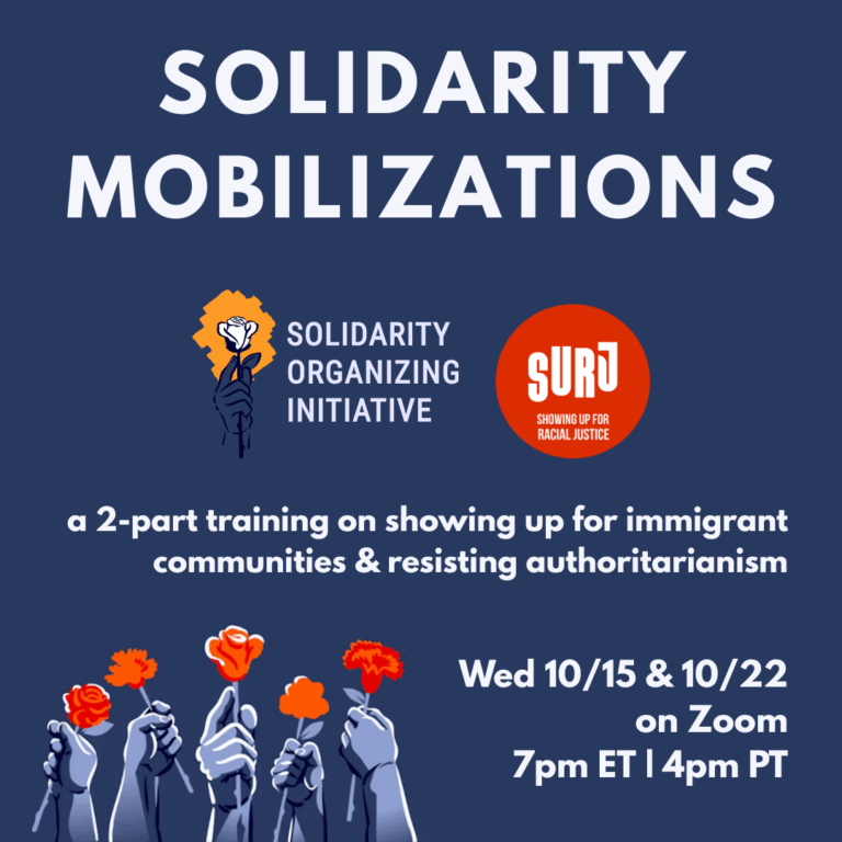 MAGA’s escalating attacks on immigrants are brutal– tearing apart families and forcing people to live in fear. As they have for decades, immigrant communities are rising up and showing us all what bravery in the face of repression looks like. We’re proud that SURJ and our partners at Solidarity Organizing